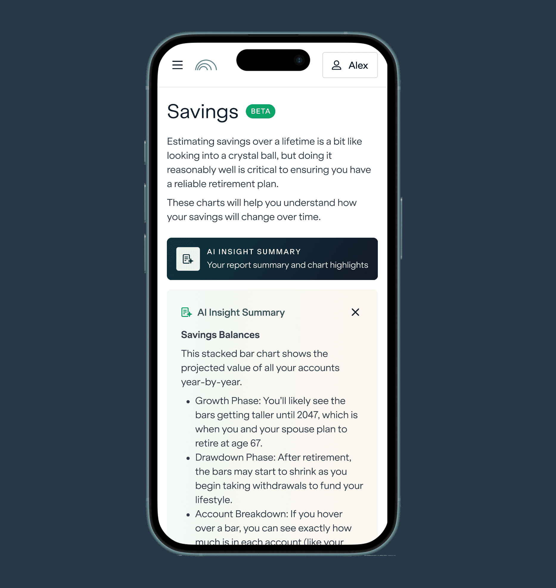 One AI summary per Insight page, surfaced via a prominent CTA. Covers all charts in context with user-specific financial details.