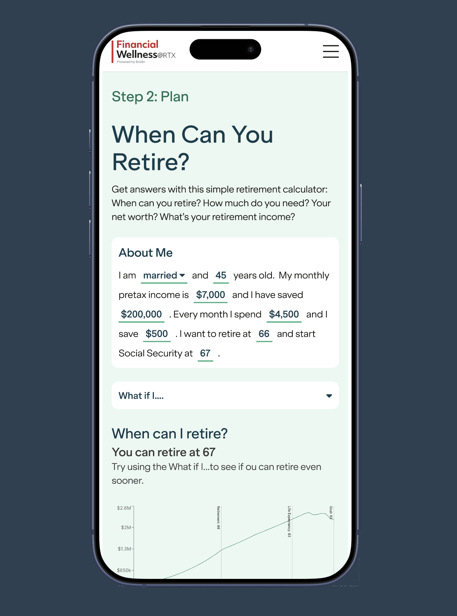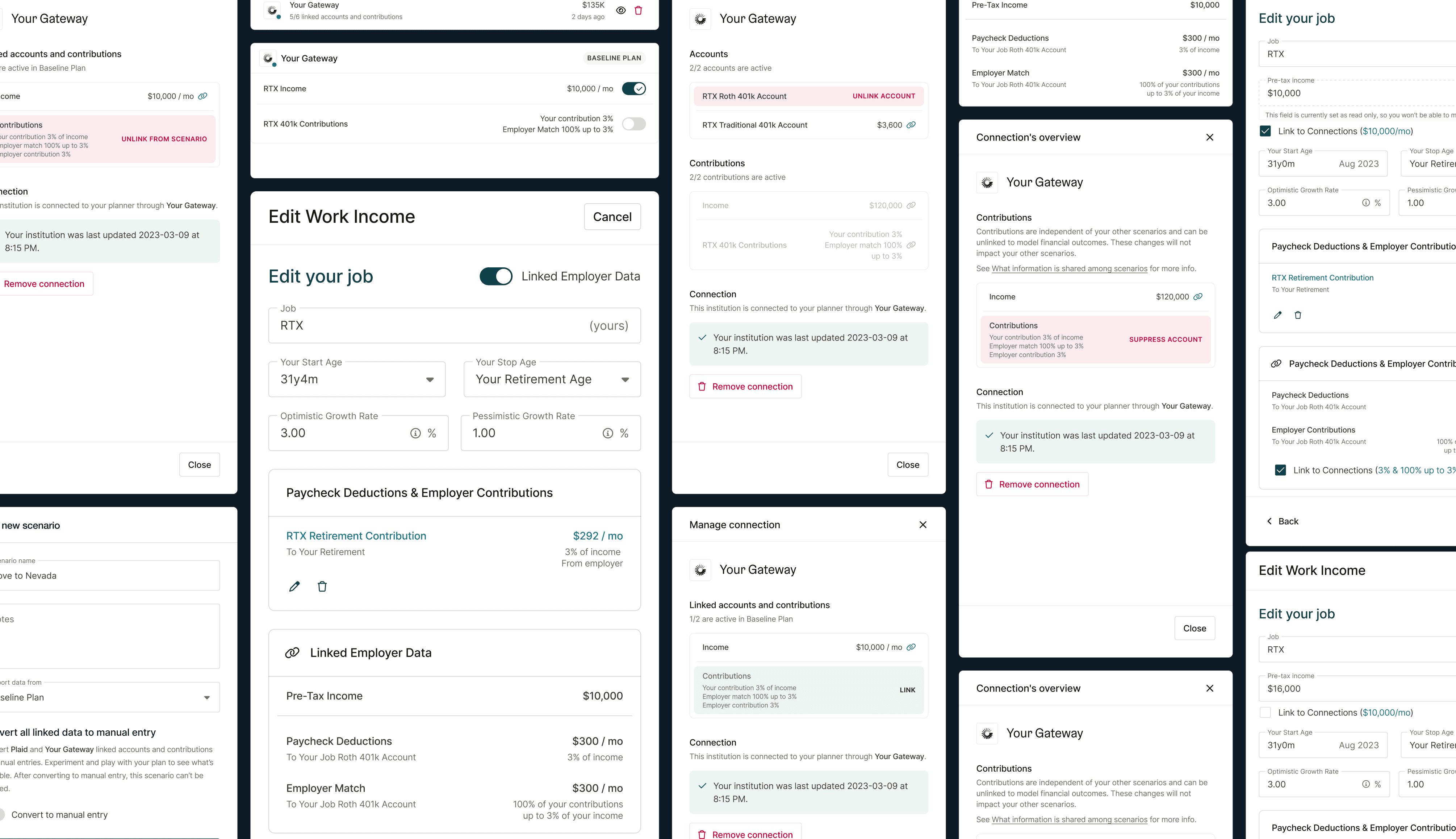 With RTX, the design was simple, users can connect their employer data, but if they wanted to model a different contribution, they needed to disconnect their RTX integration entirely.