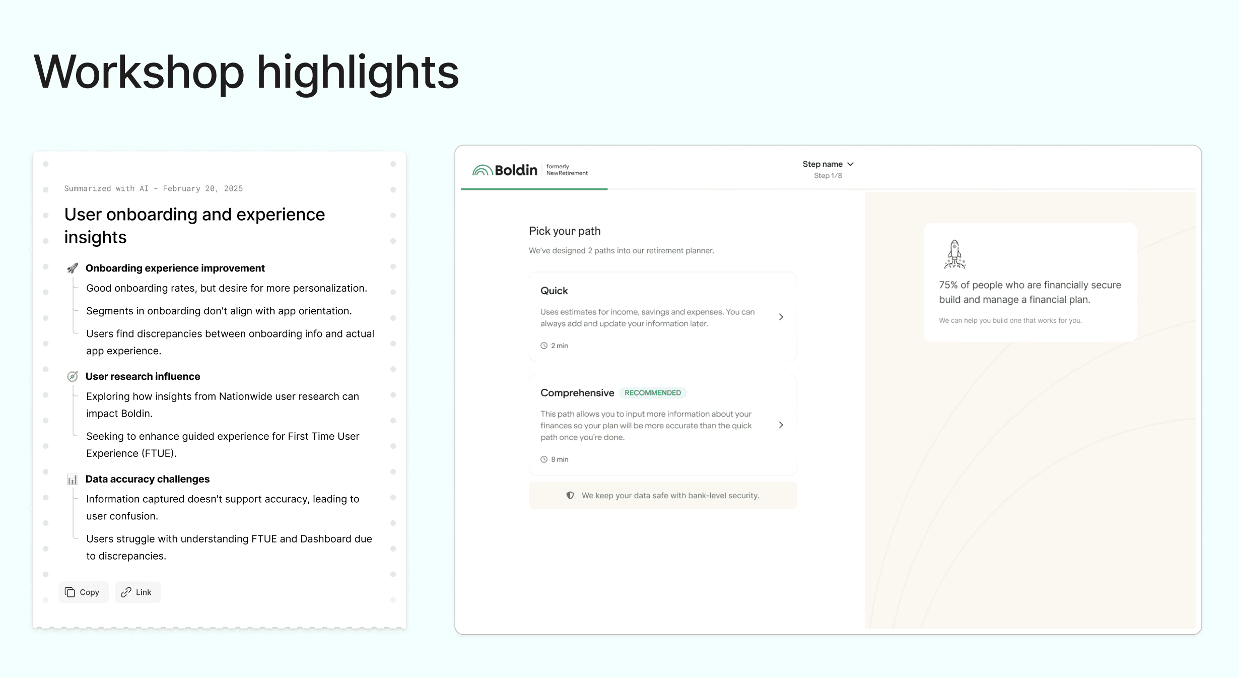 I facilitated cross-functional workshops to align the team on what we actually knew vs. what we assumed. Looking at the data, we started to put together some hypothesis and patterns. Most of our users aren't scared of complexity, in fact they crave it. They know their finances are complex, but what they needed help with was just how to get started.